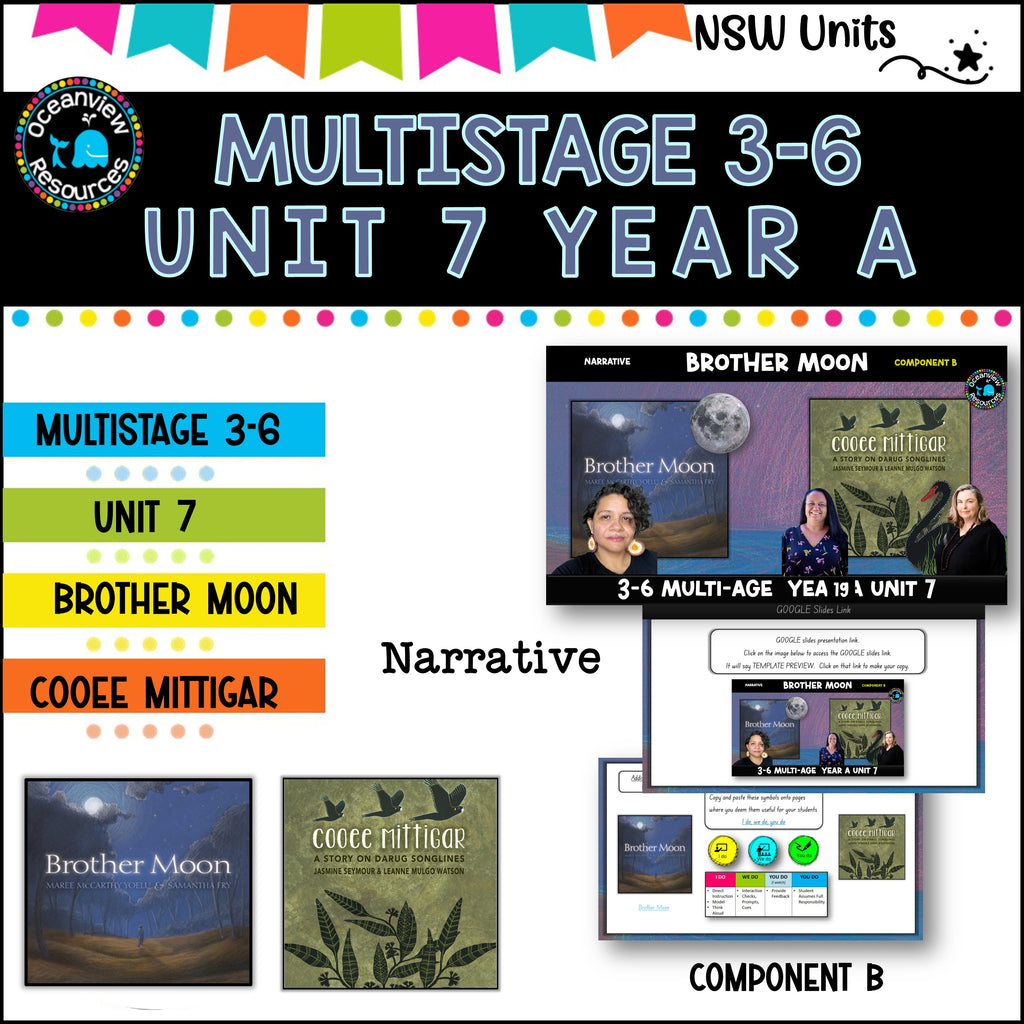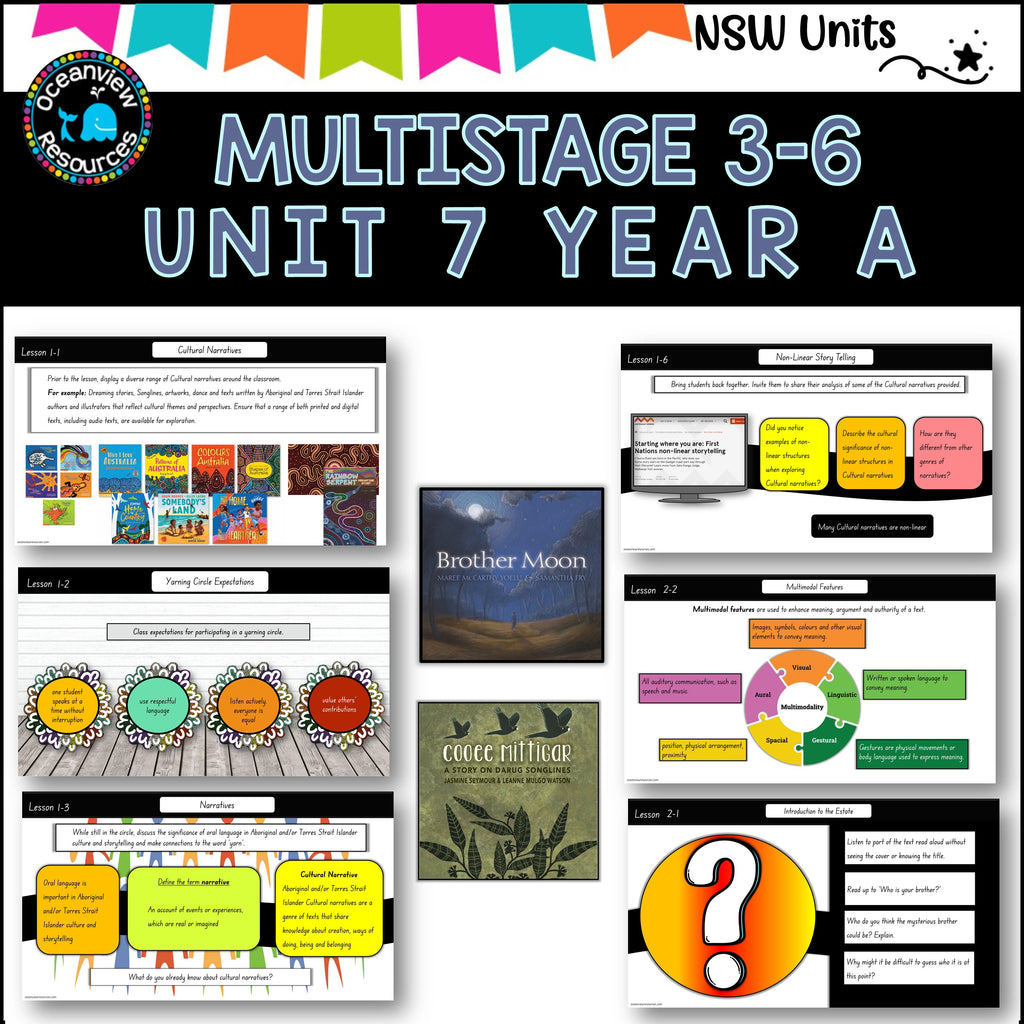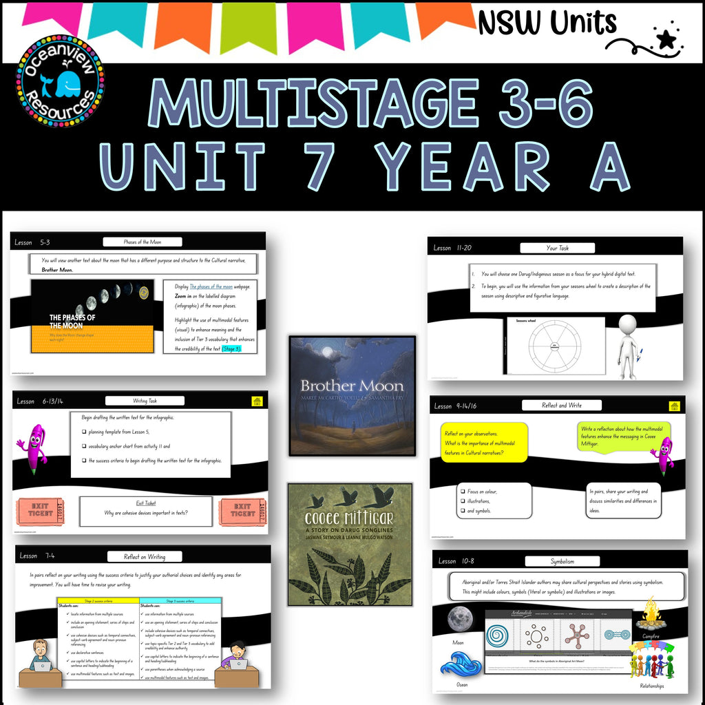 In this 5-week unit, students will explore 'narrative' and 'imagery, symbol and connotation' through 2 texts written by Aboriginal authors. They will identify the purpose and structure of Cultural narratives, including Dreaming stories and Songlines. Students will learn about the significance of natural phenomena (such as the moon and seasons) in Aboriginal and/or Torres Strait Islander culture and ways of living to create both imaginative and informative texts about these natural phenomena. Students will reflect on the Aboriginal and/or Torres Strait Islander ways of ‘storytelling’ and ‘passing down information’ by presenting a hybrid multimodal text about an Indigenous season to a younger audience..